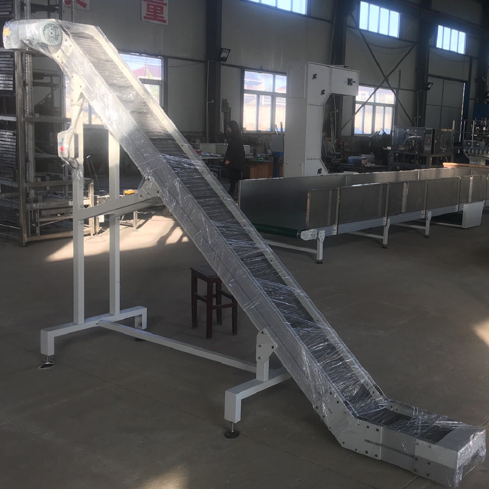 爬坡鏈板輸送機(jī)采用特制的推板,使得物料在向上或向下輸送時(shí),不會(huì)沿鏈板下滑。適用于大傾角輸送物料。如空間及物品形狀允許,可代替連續(xù)提升機(jī)使用。它是在鏈?zhǔn)捷斔蜋C(jī)的兩側(cè)鏈條間加裝板式構(gòu)件,以達(dá)到輸送型態(tài)不規(guī)則的物品,在鏈板上加裝專用工裝夾具,并根據(jù)工控要求可作為裝配線,或直接采用塑鋼平頂鏈或不銹鋼平頂鏈作為輸送載體。